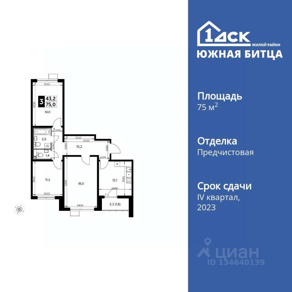 Продаётся 3-к квартира номер 310 общей площадью 75 кв.м. на 2-м этаже 20 этажного здания. Отделка Whitebox. Цена с учётом скидки.