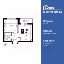 Продаётся 1-к квартира номер 75 общей площадью 34.2 кв.м. на 12-м этаже 22 этажного здания. Отделка Whitebox.