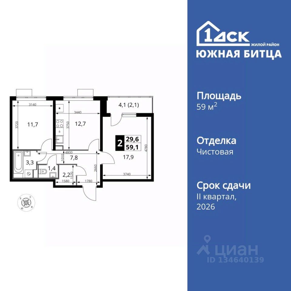 Продаётся 2-к квартира номер 398 общей площадью 59.1 кв.м. на 14-м этаже 22 этажного здания. Чистовая отделка.