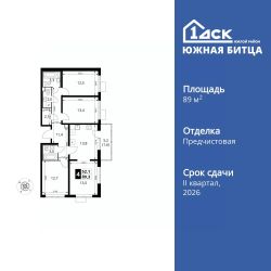 Продаётся 4-к квартира номер 592 общей площадью 89.3 кв.м. на 16-м этаже 22 этажного здания. Отделка Whitebox.