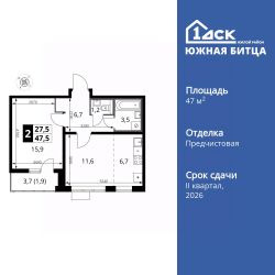 Продаётся 2-к квартира номер 618 общей площадью 47.5 кв.м. на 21-м этаже 22 этажного здания. Отделка Whitebox.