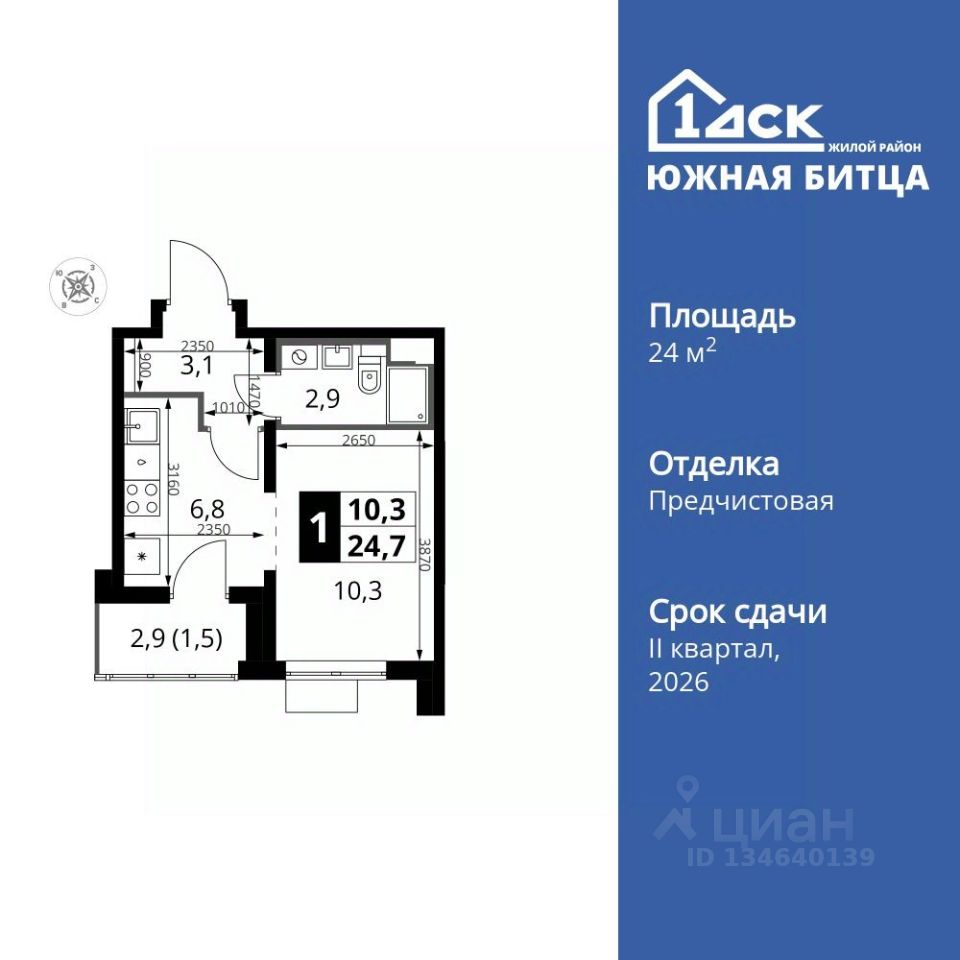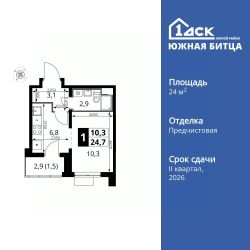 Продаётся 1-к квартира номер 172 общей площадью 24.6 кв.м. на 6-м этаже 22 этажного здания. Отделка Whitebox.