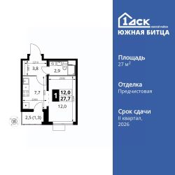 Продаётся 1-к квартира номер 766 общей площадью 27.7 кв.м. на 19-м этаже 22 этажного здания. Отделка Whitebox.