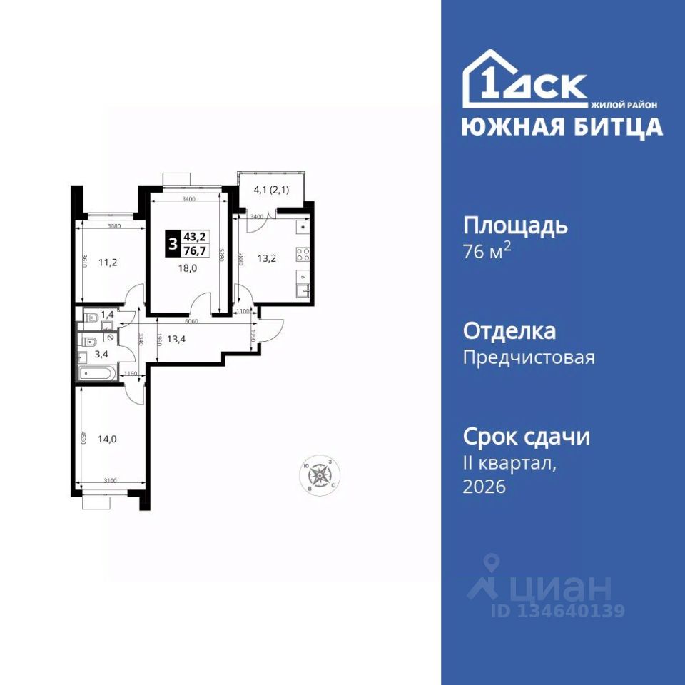 Продаётся 3-к квартира номер 525 общей площадью 76.7 кв.м. на 2-м этаже 22 этажного здания. Отделка Whitebox.
