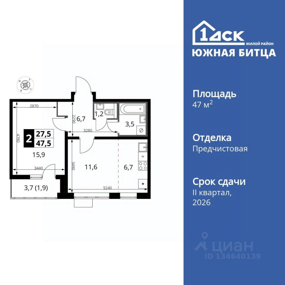 Продаётся 2-к квартира номер 558 общей площадью 47.5 кв.м. на 9-м этаже 22 этажного здания. Отделка Whitebox.