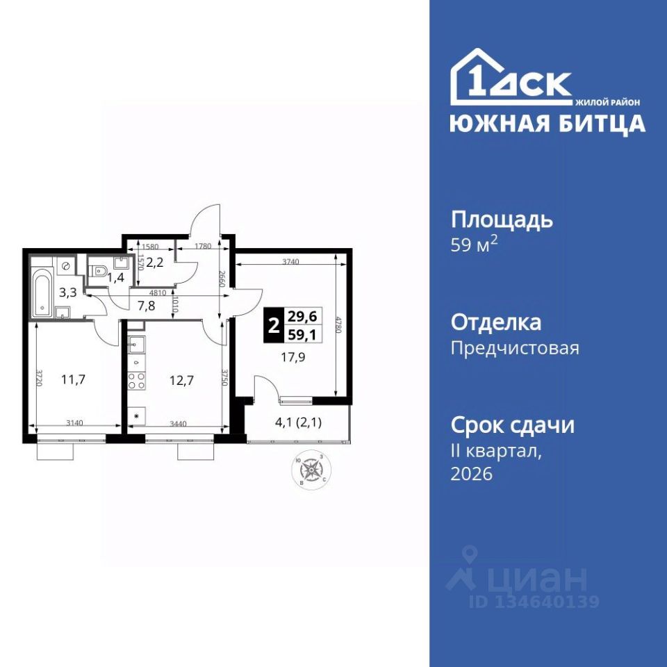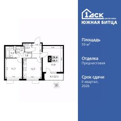 Продаётся 2-к квартира номер 614 общей площадью 59.1 кв.м. на 20-м этаже 22 этажного здания. Отделка Whitebox.
