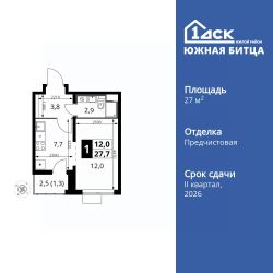 Продаётся 1-к квартира номер 710 общей площадью 27.7 кв.м. на 12-м этаже 22 этажного здания. Отделка Whitebox.