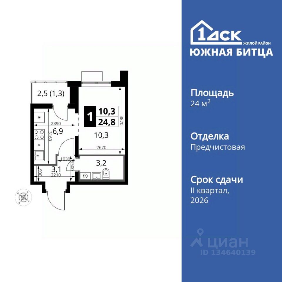 Продаётся 1-к квартира номер 730 общей площадью 24.8 кв.м. на 14-м этаже 22 этажного здания. Отделка Whitebox.