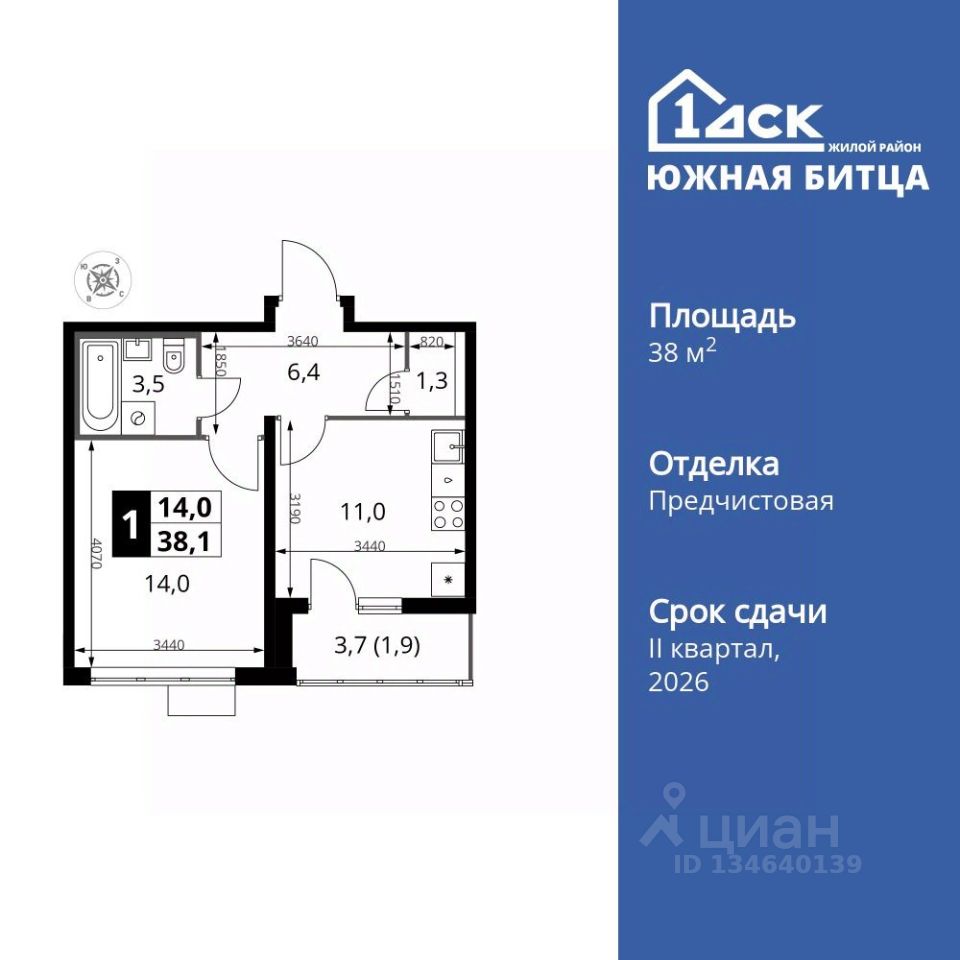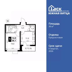 Продаётся 1-к квартира номер 791 общей площадью 38.1 кв.м. на 22-м этаже 22 этажного здания. Отделка Whitebox.