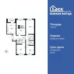 Продаётся 4-к квартира номер 361 общей площадью 100.7 кв.м. на 23-м этаже 24 этажного здания. Отделка Whitebox. Цена с учётом скидки.