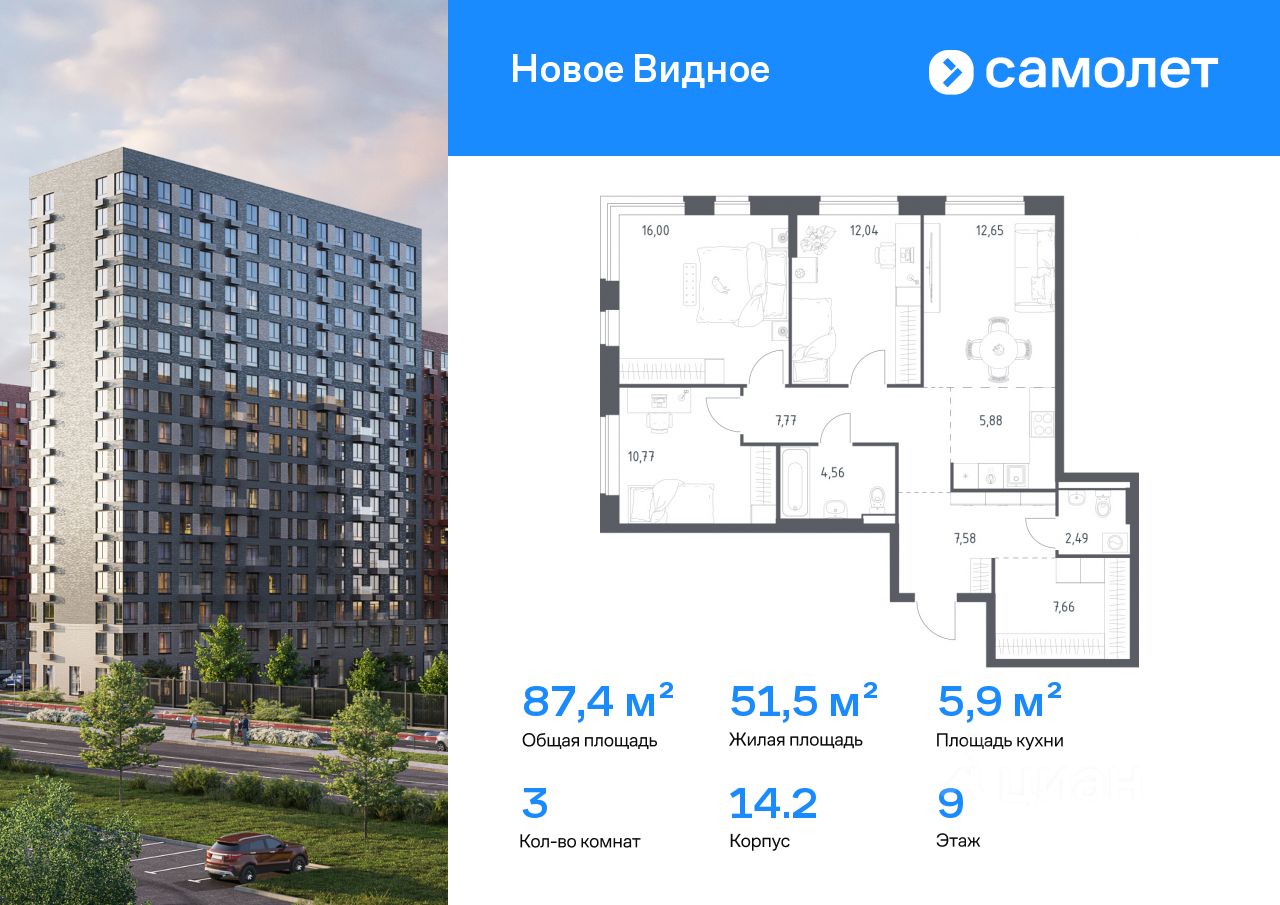 Строим кварталы для жизни с заботой о будущем. Предлагается 3-комнатная квартира комфорт-класса 87,4 кв.м в корпусе 14.2 на 9 этаже, в ЖК "Новое Видное"