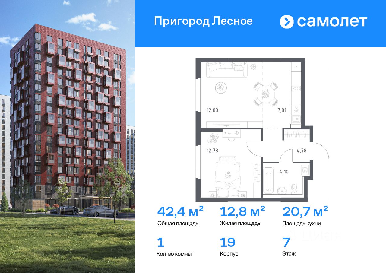 Строим кварталы для жизни с заботой о будущем. Предлагается 1-комнатная квартира комфорт-класса 42,35 кв.м в корпусе 19 на 7 этаже, в ЖК "Пригород Лесное"