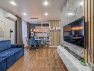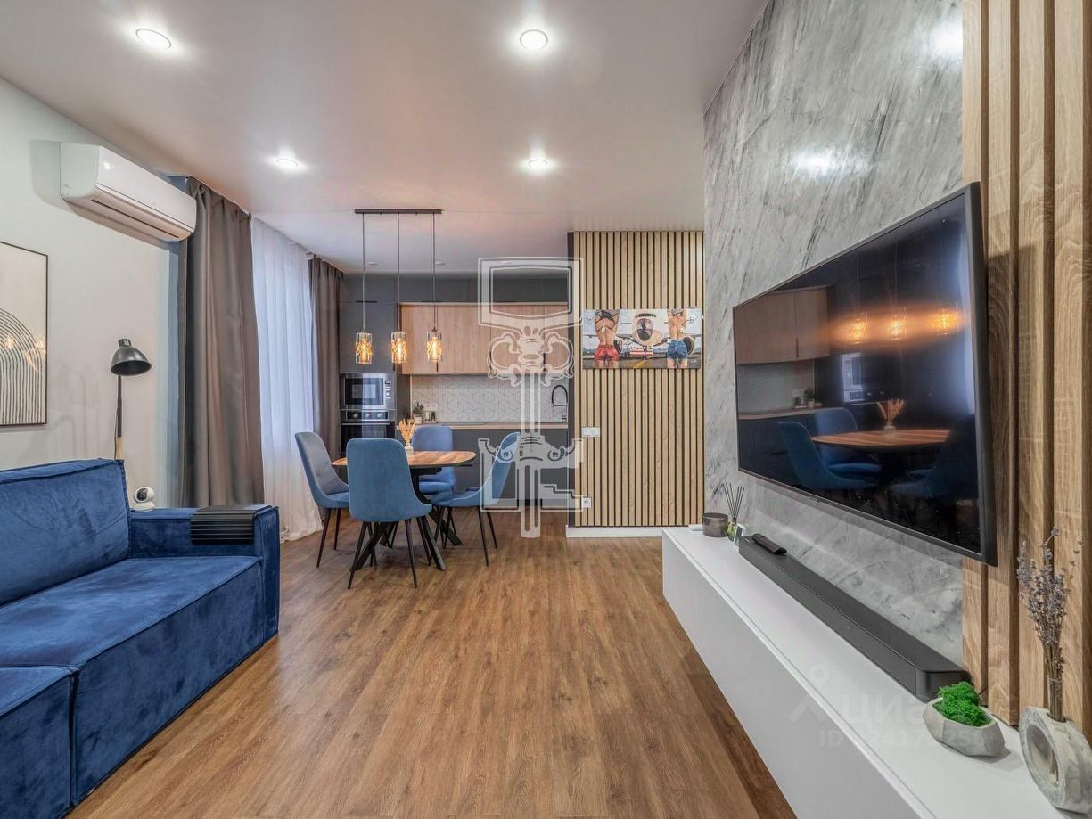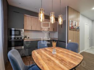 Квартира расположена на 17 этаже 17-этажного дома. Планировка включает прихожую, просторную кухню-гостиную, две изолированные жилые комнаты, санузел и гардеробную. Выполнен качественный евро-ремонт, установлены кондиционеры, есть стиральная машина. Вся мебель остаётся покупателю.
