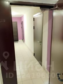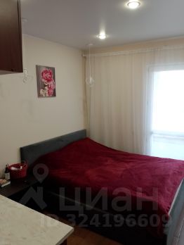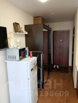 Студия правильной формы укомплектована шкафом, мебельной стенкой, диваном.