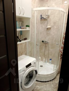 Санузел в плитке, с полноценной ванной и стиральной машиной.