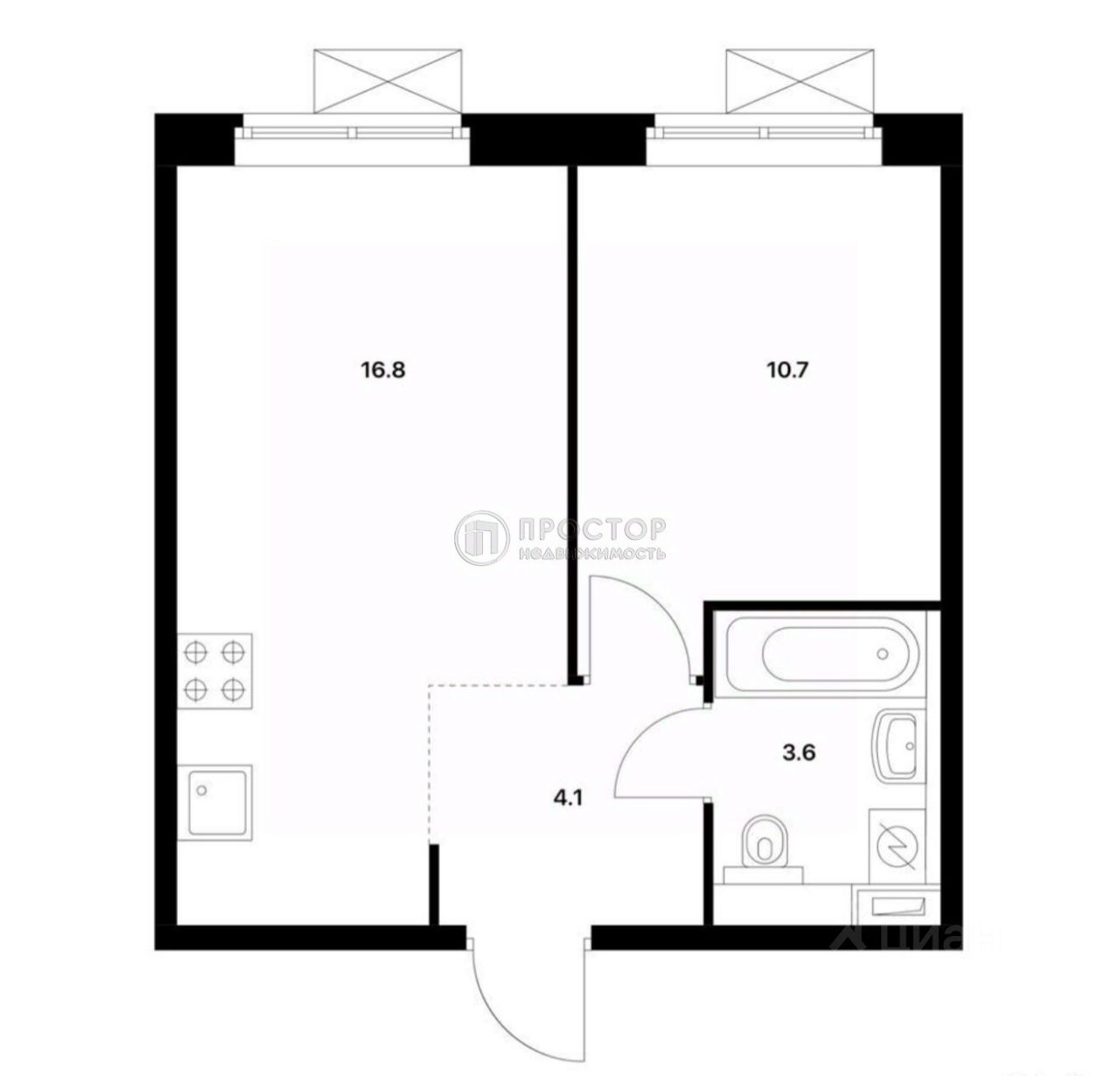 Планировка: просторная кухня гостиная 16,8м2 , изолированная спальня -10,7м2, совмещенный санузел.