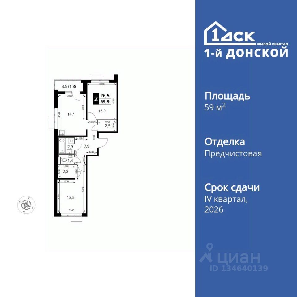 Продаётся 2-к квартира номер 405 общей площадью 59.9 кв.м. на 17-м этаже 24 этажного здания. Отделка Whitebox.