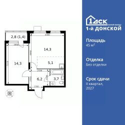 Продаётся 2-к квартира номер 621 общей площадью 45 кв.м. на 10-м этаже 24 этажного здания. Без отделки.