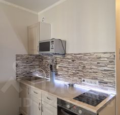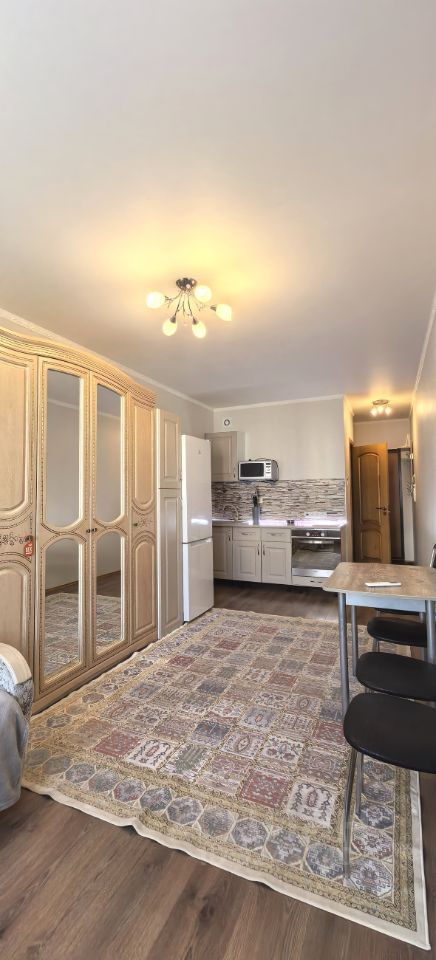 Квартира -студия площадью 20 кв. м на 4 этаже 9-этажного дома в современном ЖК Государев дом. Хороший, новый ремонт. Подходит под аренду ( можем передать арендаторов ) и как инвест проект . *Квартира полностью укомплектована для постоянного проживания. Мебель и Бытовая техника остаются в квартире . Есть кондиционер, подключение к интернету. * Прихожая : высокая обувница на 9 пар обуви, вешалка для верхней одежды, роутер. *Зона кухни: шкафы для хранения посуды, варочная панель, шкаф, микроволновая печь, холодильник, принудительная вытяжка, столовая группа с четырьмя стульями. *Зона отдыха: двуспальный диван, 4х створчатый шкаф с зеркалом, пенал. *Санузел совмещенный, оборудован ванной. Установлена стиральная машина, зеркало с полкой.