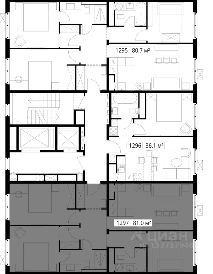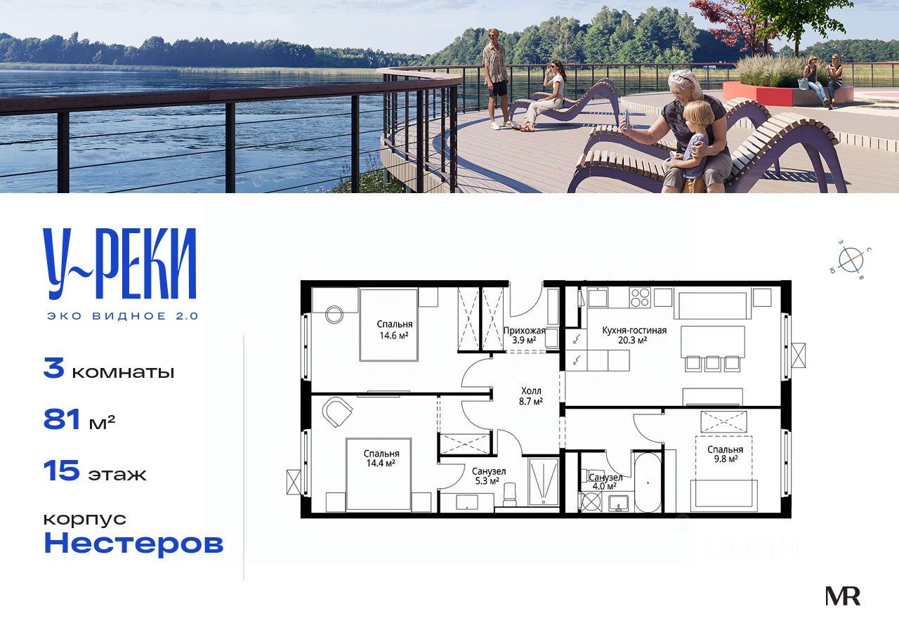 Продаётся 3-комнатная квартира общей площадью 81 м² с предчистовой отделкой в ЖК "У реки. Эко Видное 2.0" на 15-м этаже корпуса Нестеров.