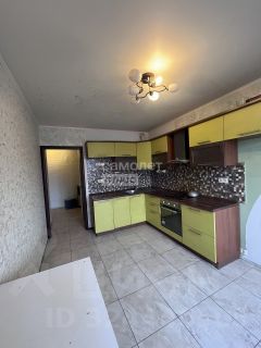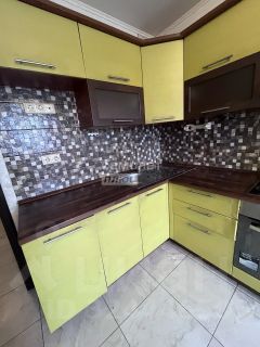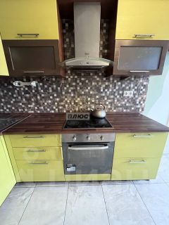 В квартире имеется кухонный гарнитур, в комнате стоит большой зеркальный шкаф купе и диван.