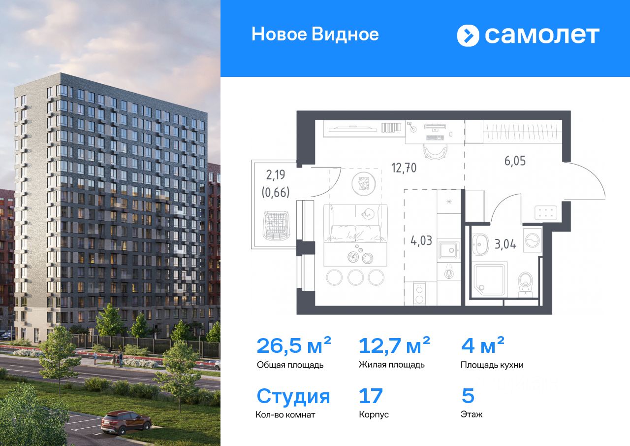 Строим кварталы для жизни с заботой о будущем. Предлагается квартира студия комфорт-класса 26,48 кв.м в корпусе 17 на 5 этаже, в ЖК "Новое Видное" Квартира без отделки. Доступность опции "отделка" и возможность комплектации мебелью и декором уточняйте у застройщика. Приобрести квартиру возможно по специальным акциям от застройщика, с текущими условиями акций можно ознакомиться в блоке "Акций". Цена динамическая и может отличаться, уточняйте актуальность у застройщика. Жилой комплекс "Новое Видное" — масштабный проект из 30 урбан-блоков, который находится рядом с Видновским лесопарком и в 8 км от МКАДа. В отделке фасадов — декоративный кирпич в белом, сером, бежевом и терракотовом оттенках. Такое сочетание оттенков словно нежная игра света на песчаной глади озера — тонкие линии и мягкие переливы создают волшебный узор, отражающий красоту природы. Жить здесь легко и комфортно: рядом с домом будет все важное и необходимое — от магазинов и кафе до плейхабов и набережной. В "Новом Видном" вы сможете слушать джазовые мотивы города и наслаждаться освежающей близостью леса. "Новое Видное" — это: 1. До МКАДа — 8 км 2. 20 минут ходьбы или 5 минут на авто до ж/д станции Калинина 3. 25 минут на авто до аэропорта Домодедово 4. В будущем — прямой выезд на Каширское шоссе 5. Видновский парк и Пуговичинский пруд рядом с домом 6. Музей-заповедник "Горки Ленинские" в нескольких минутах на авто 7. 12 минут на авто до конных клубов "Задор", "Юланта" и "Казачий Дозор" 8. 4 школы, 7 детских садов, поликлиника, станция скорой помощи 9. Приватные дворы без машин 10. Покет-парки для спокойного отдыха 11. Спортивные и игровые площадки 12. Входы в корпуса без ступеней и высоких порогов 13. Помещения для колясок в лобби 14. Панорамное остекление балконов 15. Велодорожки по всей территории квартала