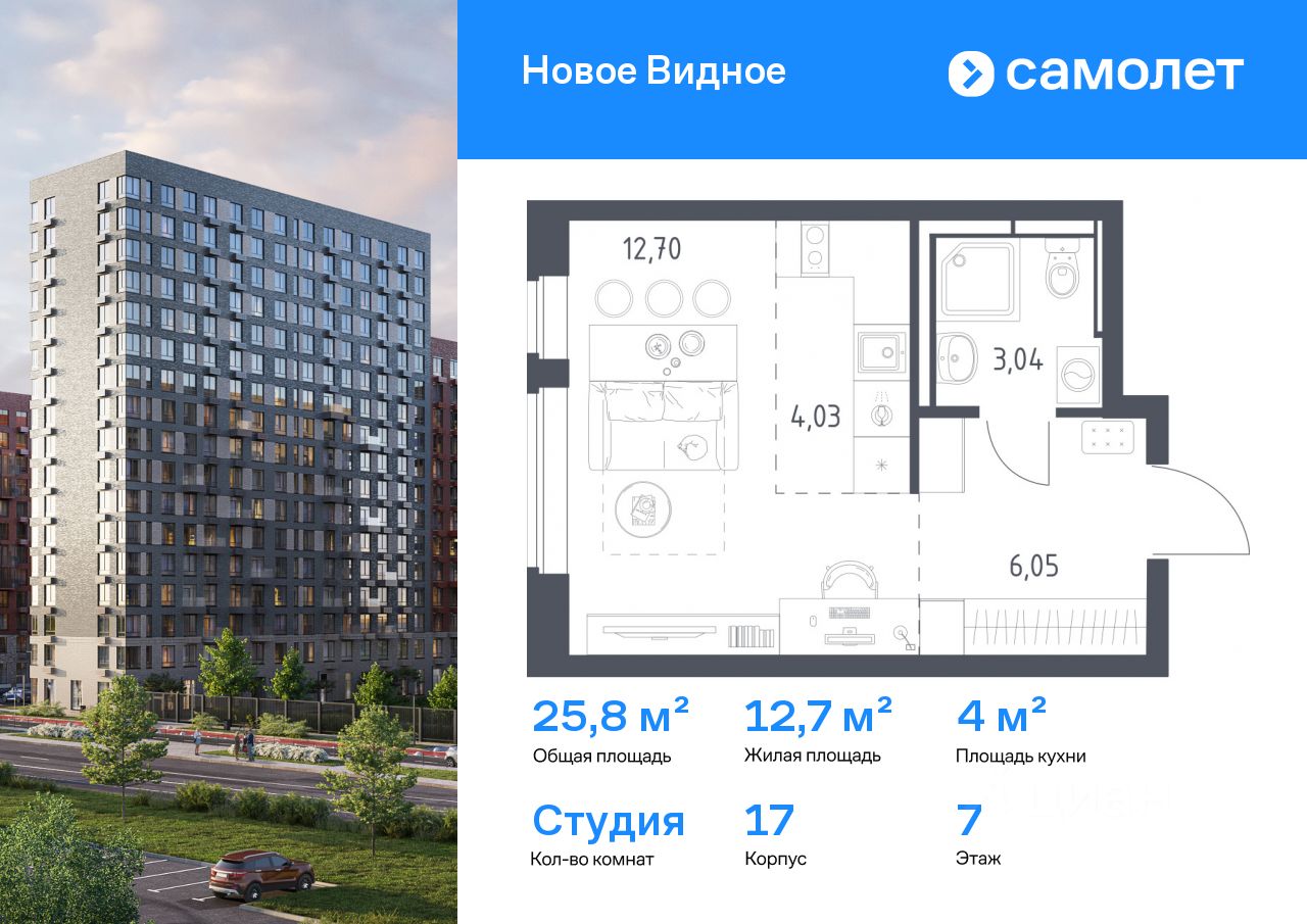 Строим кварталы для жизни с заботой о будущем. Предлагается квартира студия комфорт-класса 25,82 кв.м в корпусе 17 на 7 этаже, в ЖК "Новое Видное" Квартира без отделки. Доступность опции "отделка" и возможность комплектации мебелью и декором уточняйте у застройщика. Приобрести квартиру возможно по специальным акциям от застройщика, с текущими условиями акций можно ознакомиться в блоке "Акций". Цена динамическая и может отличаться, уточняйте актуальность у застройщика. Жилой комплекс "Новое Видное" — масштабный проект из 30 урбан-блоков, который находится рядом с Видновским лесопарком и в 8 км от МКАДа. В отделке фасадов — декоративный кирпич в белом, сером, бежевом и терракотовом оттенках. Такое сочетание оттенков словно нежная игра света на песчаной глади озера — тонкие линии и мягкие переливы создают волшебный узор, отражающий красоту природы. Жить здесь легко и комфортно: рядом с домом будет все важное и необходимое — от магазинов и кафе до плейхабов и набережной. В "Новом Видном" вы сможете слушать джазовые мотивы города и наслаждаться освежающей близостью леса. "Новое Видное" — это: 1. До МКАДа — 8 км 2. 20 минут ходьбы или 5 минут на авто до ж/д станции Калинина 3. 25 минут на авто до аэропорта Домодедово 4. В будущем — прямой выезд на Каширское шоссе 5. Видновский парк и Пуговичинский пруд рядом с домом 6. Музей-заповедник "Горки Ленинские" в нескольких минутах на авто 7. 12 минут на авто до конных клубов "Задор", "Юланта" и "Казачий Дозор" 8. 4 школы, 7 детских садов, поликлиника, станция скорой помощи 9. Приватные дворы без машин 10. Покет-парки для спокойного отдыха 11. Спортивные и игровые площадки 12. Входы в корпуса без ступеней и высоких порогов 13. Помещения для колясок в лобби 14. Панорамное остекление балконов 15. Велодорожки по всей территории квартала