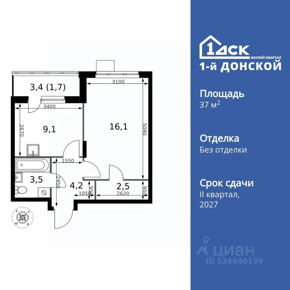 Продаётся 1-к квартира номер 27 общей площадью 37.1 кв.м. на 4-м этаже 24 этажного здания. Без отделки.