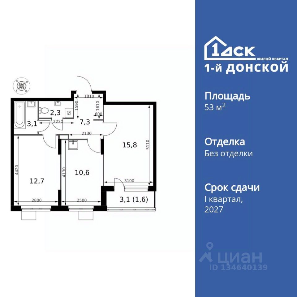 Продаётся 2-к квартира номер 396 общей площадью 53.4 кв.м. на 13-м этаже 24 этажного здания. Без отделки.