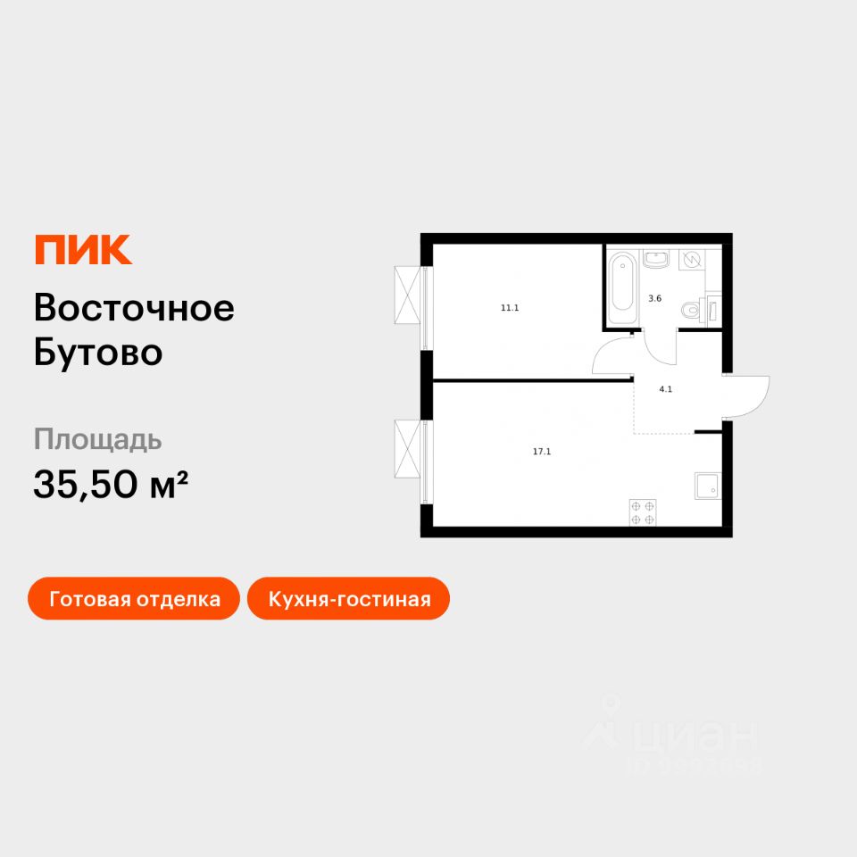 Продаётся 1-комн. квартира площадью 35,5 кв.м на 16 этаже 16 этажного дома (Корпус 42, Секция 2) проекта ПИК Восточное Бутово. Светлый просторный подъезд на уровне земли, функциональная планировка, большие окна, c отделкой.