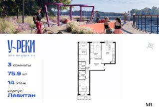 Продаётся 3-комнатная квартира общей площадью 75.90 м² с предчистовой отделкой в ЖК "У реки. Эко Видное 2.0" на 14-м этаже 17 этажного корпуса Левитан.