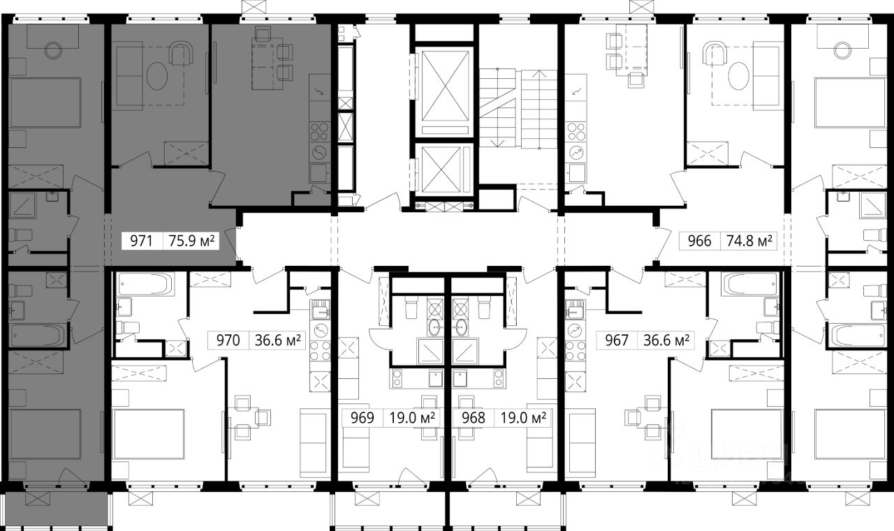 Семнадцатиэтажный корпус "Левитан" состоит из 13 секций, образующих в плане закрытый периметр двора.