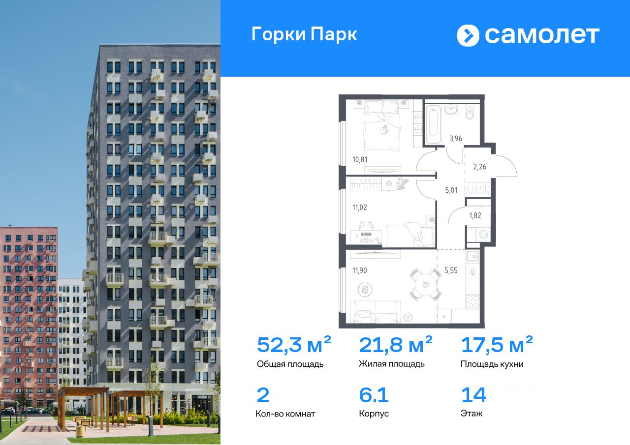 Строим кварталы для жизни с заботой о будущем. Предлагается 2-комнатная квартира комфорт-класса 52,33 кв.м в корпусе 6.1 на 14 этаже, в ЖК "Горки Парк"