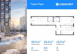 Строим кварталы для жизни с заботой о будущем. Предлагается 2-комнатная квартира комфорт-класса 56,47 кв.м в корпусе 8.1 на 3 этаже, в ЖК "Горки Парк"
