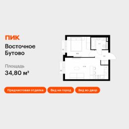 Продаётся 1-комн. квартира площадью 34,8 кв.м на 12 этаже 17 этажного дома (Корпус 48, Секция 2) проекта ПИК Восточное Бутово. Светлый просторный подъезд на уровне земли, функциональная планировка, большие окна, предчистовая отделка.