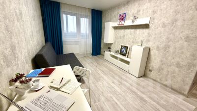 •ЖИЛАЯ КОМНАТА-17 м² с большим балконом и панорамным видом на закаты.диван раскладной, шкафкупе с зеркалом, горка для аудио и радиоаппаратуры, стол со стульями, шторы и жалюзи.