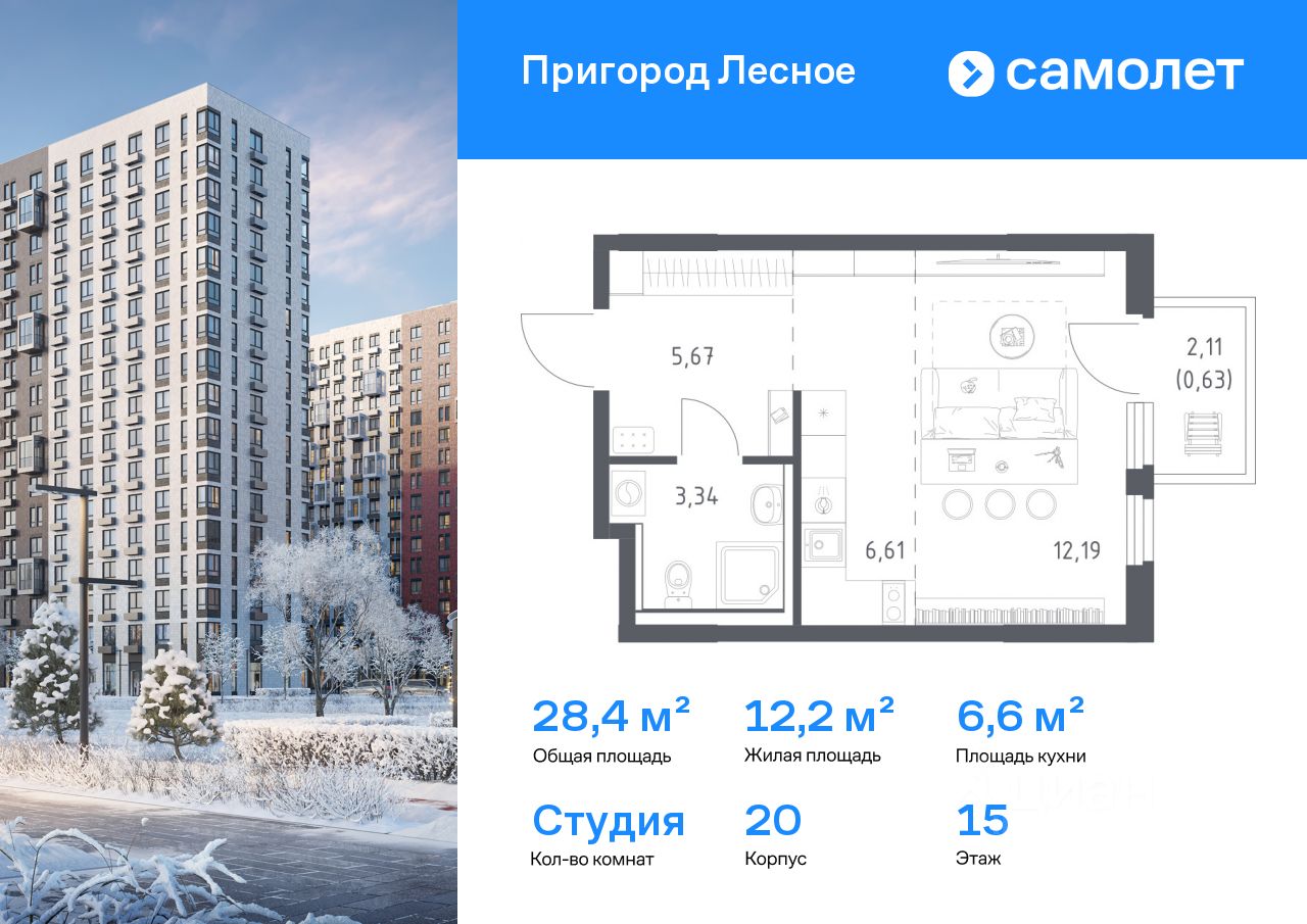 Строим кварталы для жизни с заботой о будущем. Предлагается квартира студия комфорт-класса 28,44 кв.м в корпусе 20 на 15 этаже, в ЖК "Пригород Лесное"
