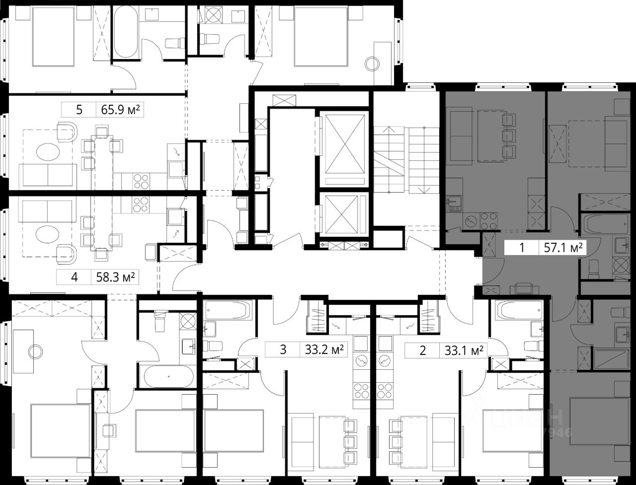Продаётся 2-комнатная квартира общей площадью 57.10 м² с предчистовой отделкой в ЖК "У реки. Эко Видное 2.0" на 2-м этаже 17 этажного корпуса Левитан.