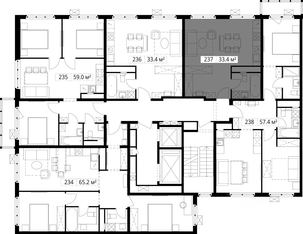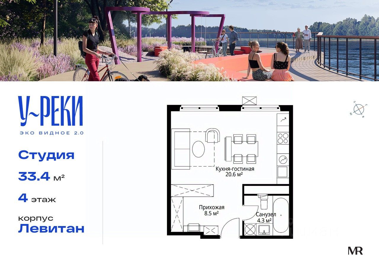Продаётся студия общей площадью 33.40 м² с чистовой отделкой в ЖК "У реки. Эко Видное 2.0" на 4-м этаже 17 этажного корпуса Левитан.