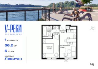Продаётся 1-комнатная квартира общей площадью 36.20 м² без отделки в ЖК "У реки. Эко Видное 2.0" на 5-м этаже 17 этажного корпуса Левитан.