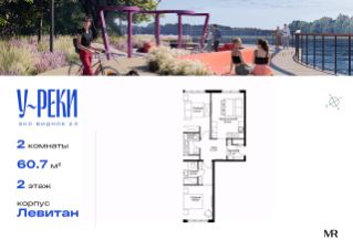 Продаётся 2-комнатная квартира общей площадью 60.70 м² с предчистовой отделкой в ЖК "У реки. Эко Видное 2.0" на 2-м этаже 17 этажного корпуса Левитан.
