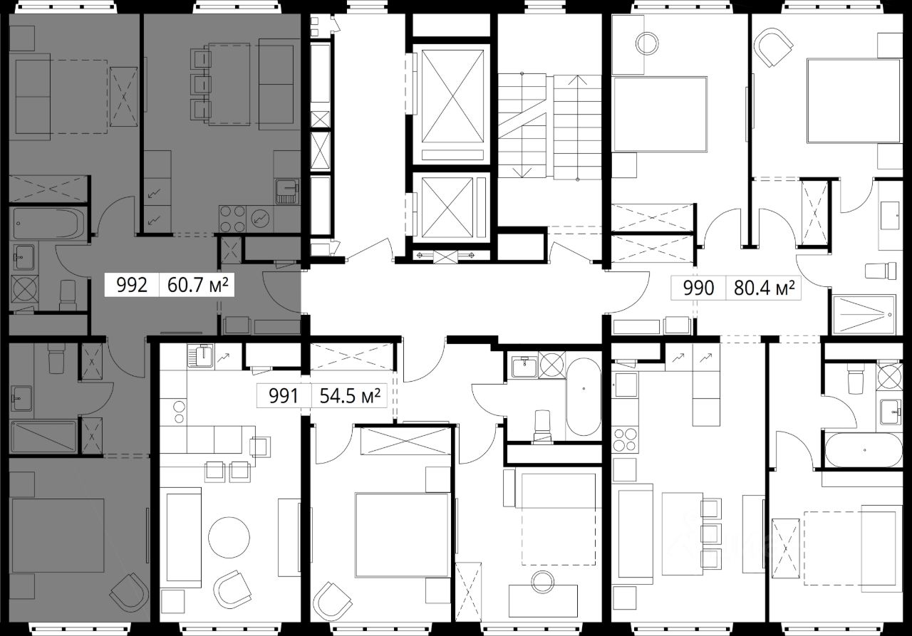 Семнадцатиэтажный корпус "Левитан" состоит из 13 секций, образующих в плане закрытый периметр двора.