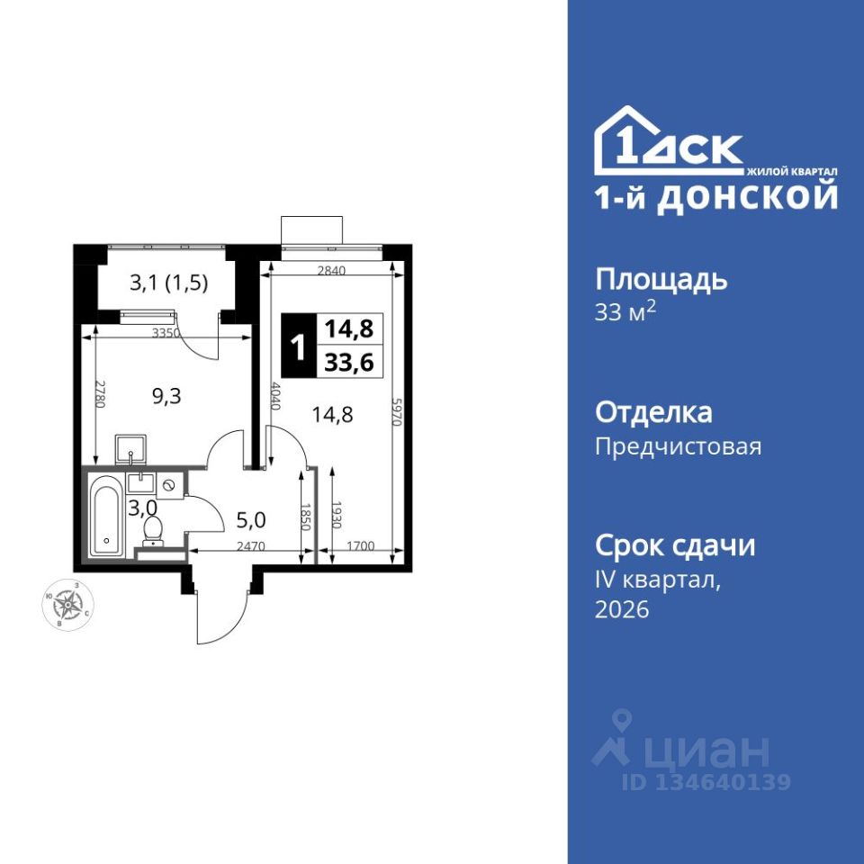 Продаётся 1-к квартира номер 172 общей площадью 33.6 кв.м. на 17-м этаже 24 этажного здания. Отделка Whitebox.