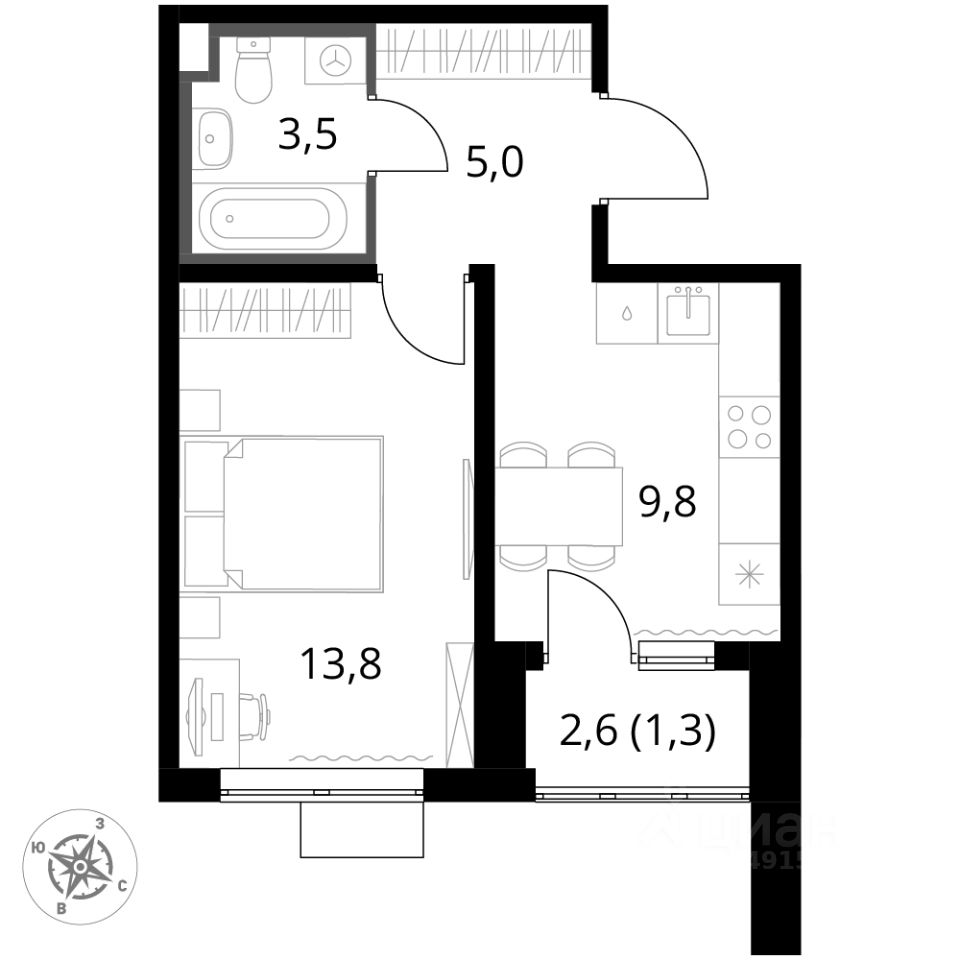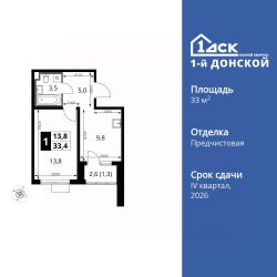 Продаётся 1-к квартира номер 547 общей площадью 33.4 кв.м. на 7-м этаже 24 этажного здания. Отделка Whitebox.