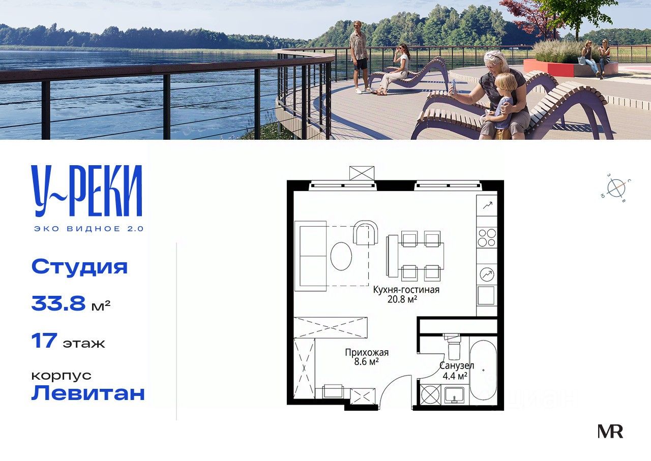 Продаётся студия общей площадью 33.80 м² с чистовой отделкой в ЖК "У реки. Эко Видное 2.0" на 17-м этаже 17 этажного корпуса Левитан.