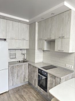 ZAR, материал фасадов - пластик, вся на доводчиках фирмы BLUM Австия) со встроенной бытовой техникой. Ремонт делали для себя, с любовью.