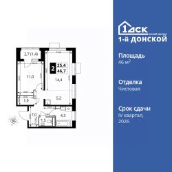 Продаётся 2-к квартира номер 440 общей площадью 46.7 кв.м. на 20-м этаже 24 этажного здания. Чистовая отделка.