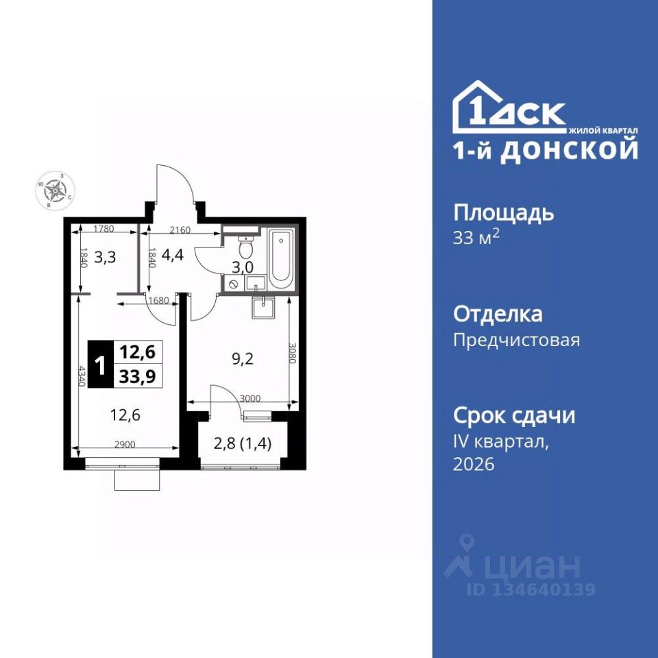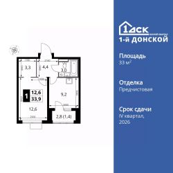 Продаётся 1-к квартира номер 766 общей площадью 33.9 кв.м. на 5-м этаже 24 этажного здания. Отделка Whitebox.