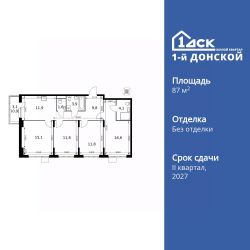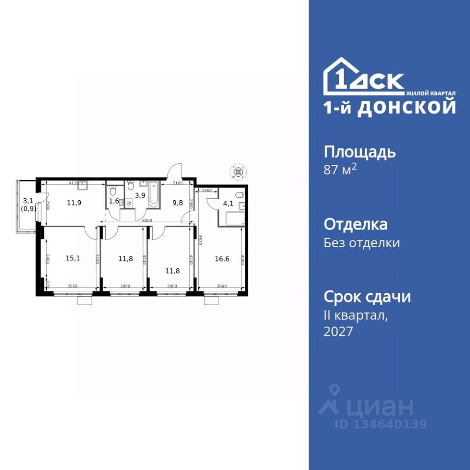 Продаётся 4-к квартира номер 123 общей площадью 87.5 кв.м. на 13-м этаже 24 этажного здания. Без отделки.