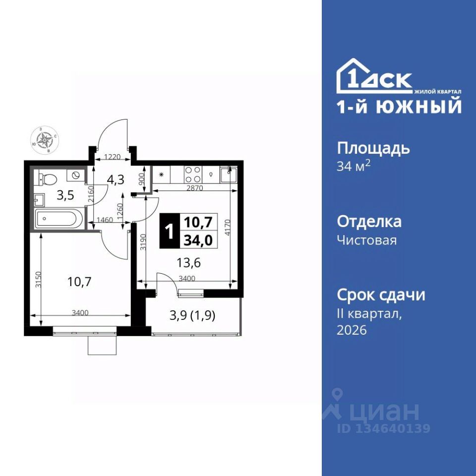 Продаётся 1-к квартира номер 801 общей площадью 34 кв.м. на 2-м этаже 24 этажного здания. Чистовая отделка.